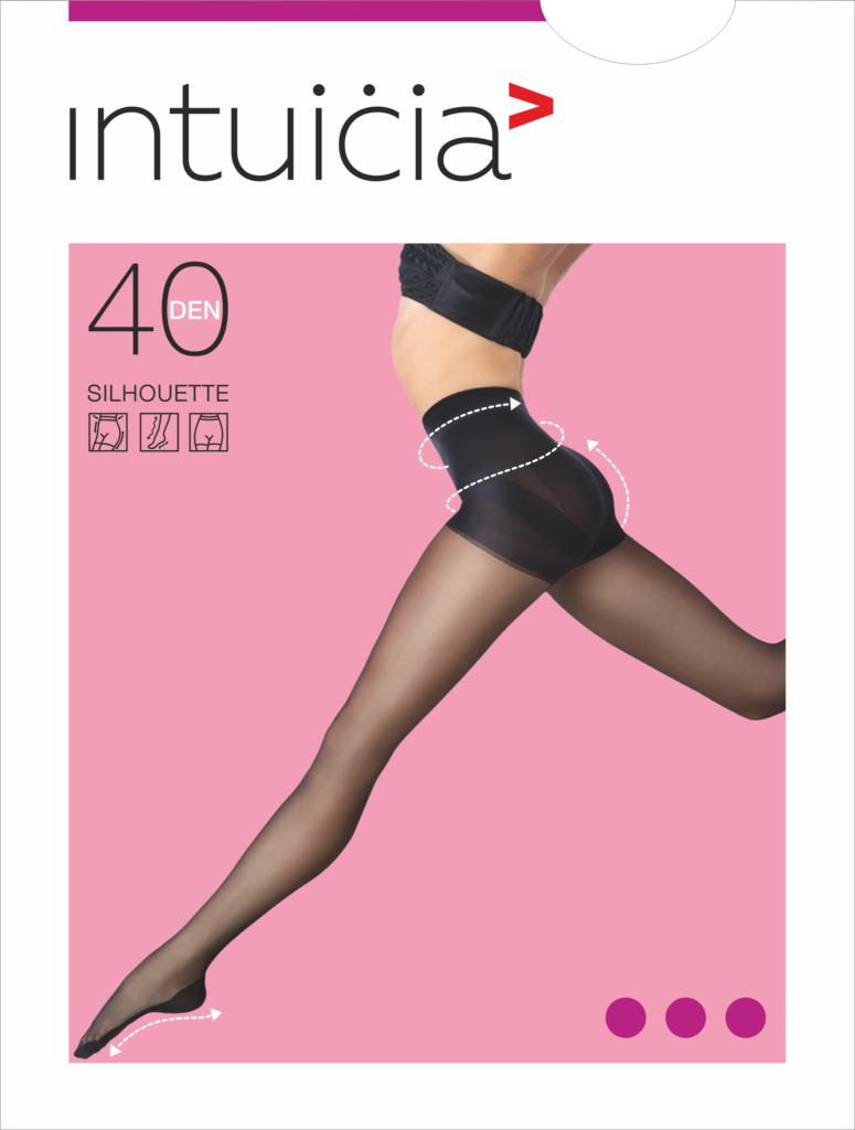 SILHOUETTE 40 – semi-transparent elastic tights of medium density with the effect of the slim fit modelling. They have distributed compression throughout the leg and excreted compacted massage foot. Special high shorts model the figure, starting below the level of the thigh, with an incompressible upper diameter of the leg; form a slim fit, reducing the circumference of the thigh and waist. High-rise tights.
