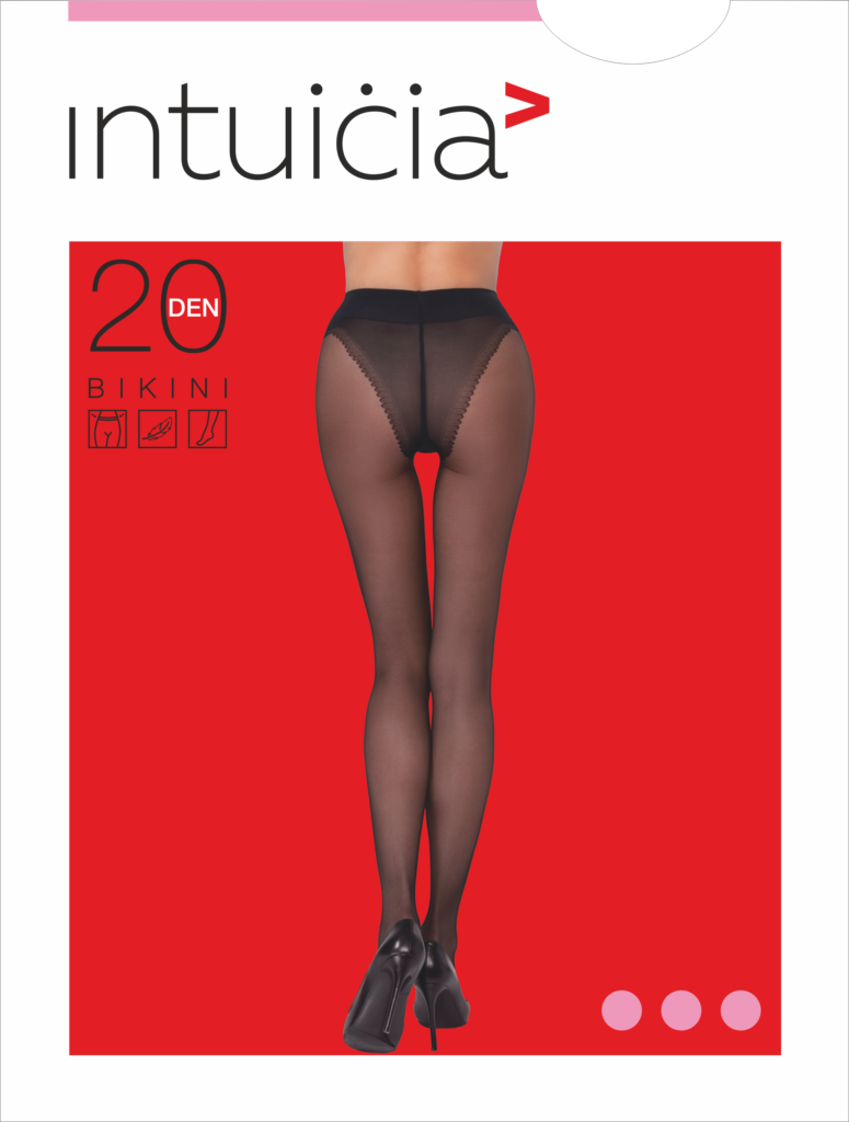 BIKINI 20 – тонкі прозорі елегантні еластичні колготки з верхньою частиною у вигляді вишуканих мереживних трусиків-бікіні. Мають класичну посадку – на талії. Напівматове м’яке полотно без вираженого блиску. Широкий та комфортний пояс.