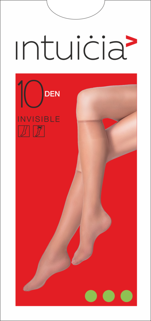 INVISIBLE 10 – ультра тонкі абсолютно прозорі еластичні гольфи. Мають вузьку, практично невидиму резинку, що не сповзає з ноги. Ефект «голих ніг» і ефект make-up роблять образ досконалим і елегантним. Дихаюче полотно дозволяє почувати себе комфортно навіть у спекотний час. Гольфи універсального розміру.